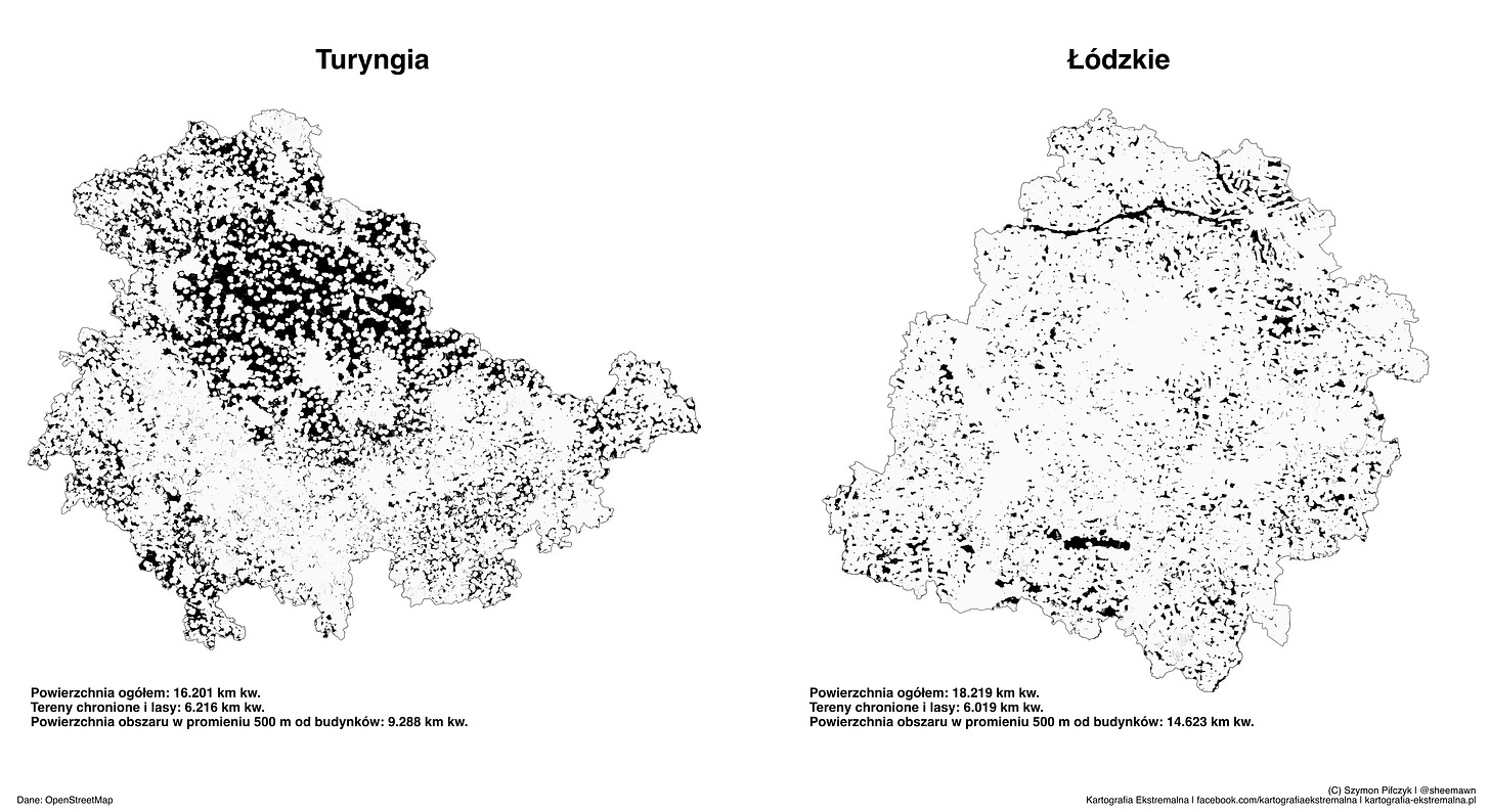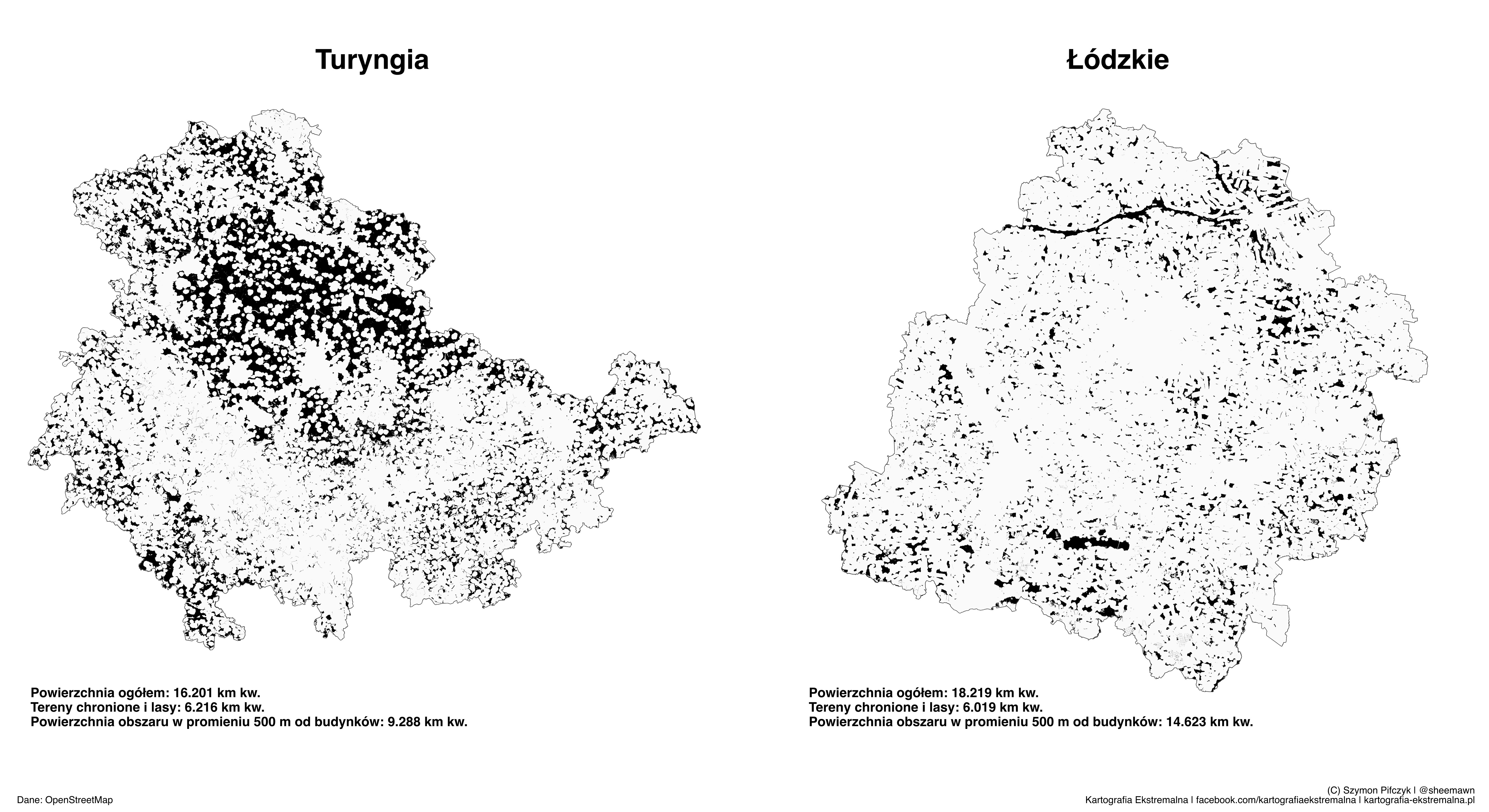 W obu przypadkach obszary chronione w różny sposób stanowią około 1/3 powierzchni regionu (nieco więcej w Turyngii). Zostaje jednak sporo miejsca. Teraz jednak musimy odjąć obszary blisko zabudowań. I tu jest pies pogrzebany. Jeśli nie chcemy budować wiatraków w odległości 500 metrów od zabudowań1, w łódzkim (z powodu omawianego tutaj chaosu przestrzennego) pozbawiamy się praktycznie całego terenu regionu! W promieniu 500 metrów od zabudowań leży ponad 80% terenu łódzkiego, a doliczając obszary chronione, dostępny teren spada poniżej 5%. W Turyngii czarne plamy są o wiele bardziej widoczne.
