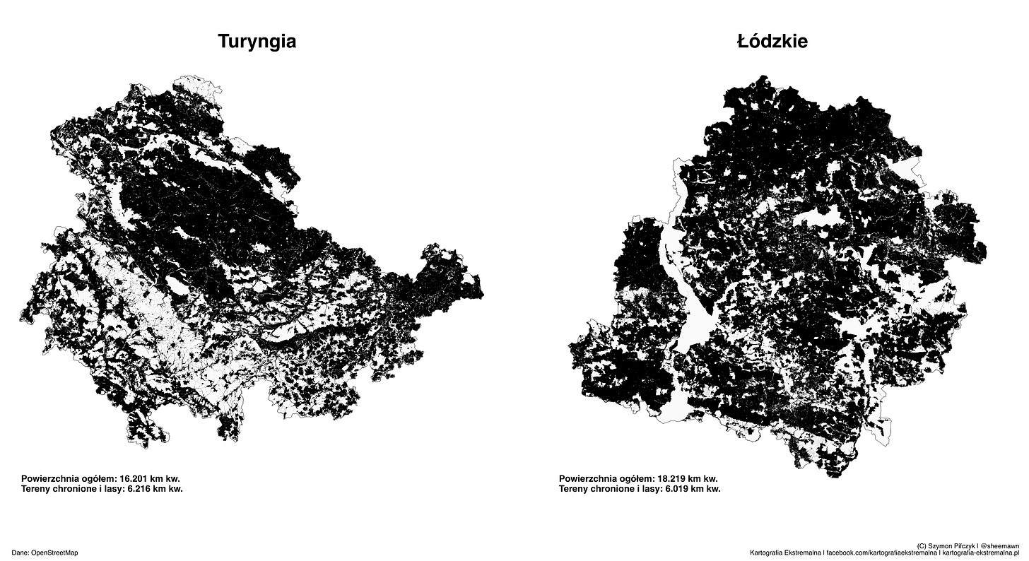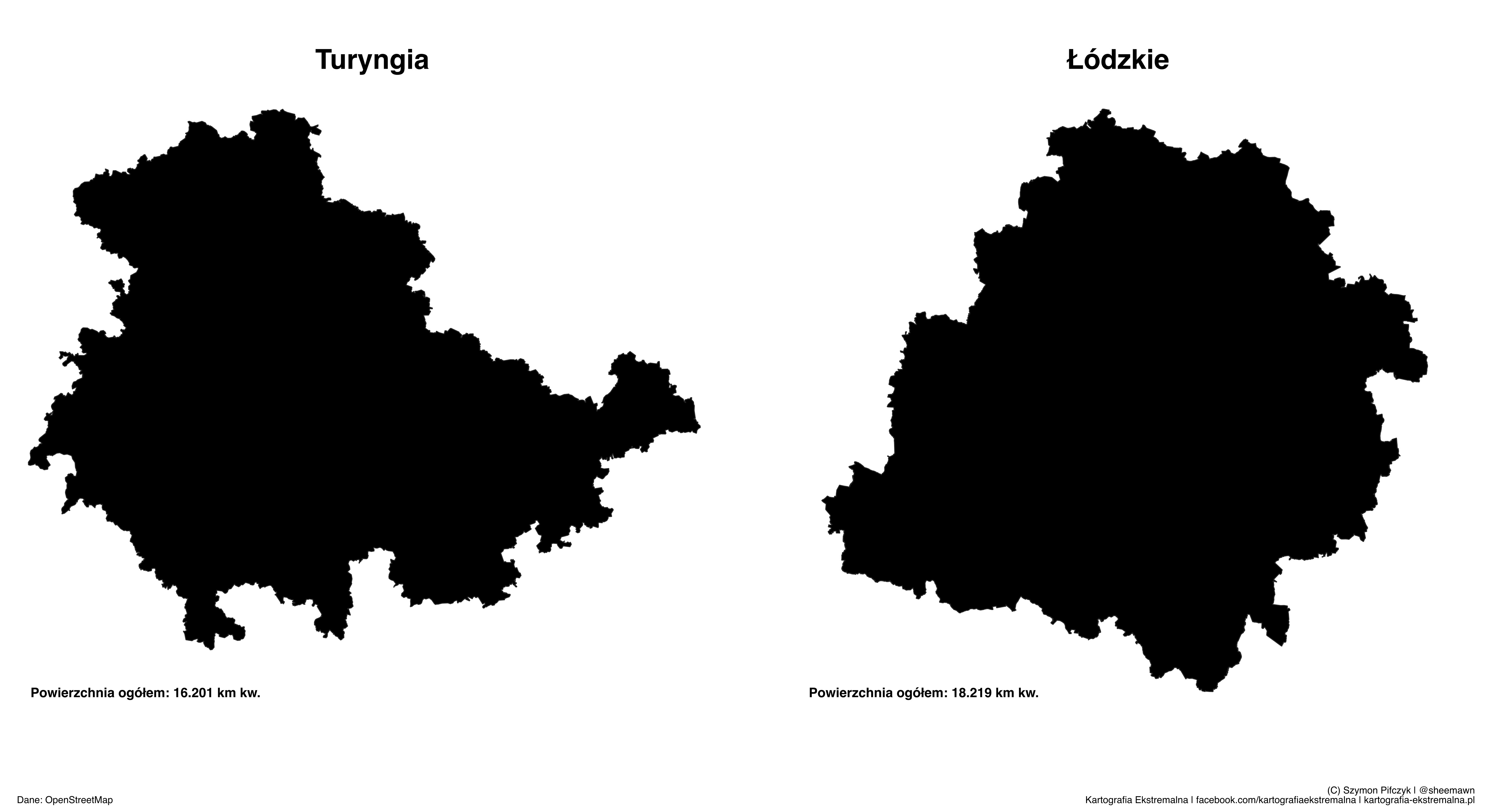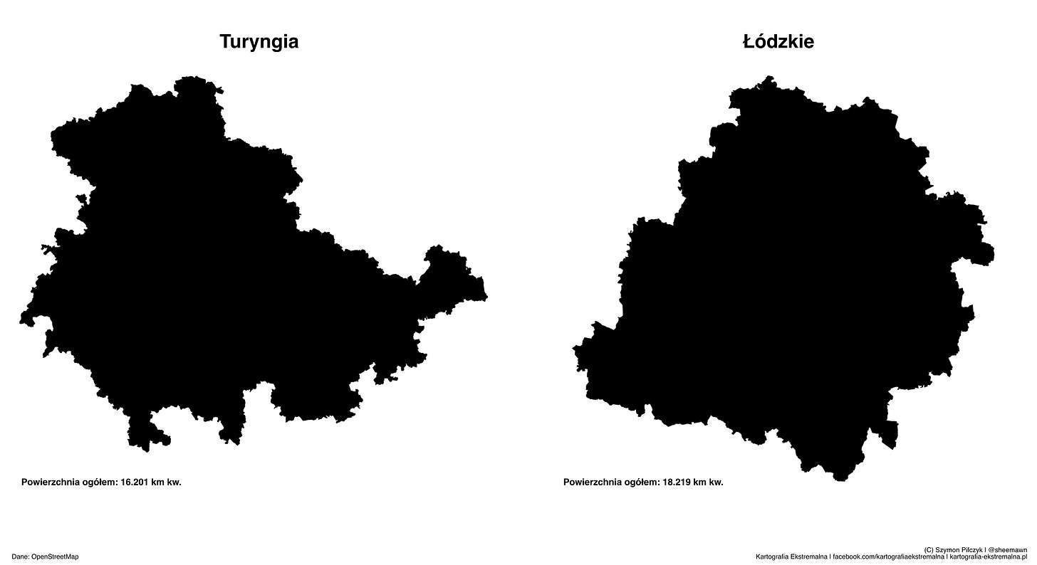 Spróbujmy więc pokazać to na nieco większym przykładzie. Porównajmy z jednej strony województwo łódzkie w Polsce, a z drugiej kraj związkowy Turyngia. To jednostki dość podobne: łódzkie jest o około 12% większe, ale też jednocześnie o 12% ludniejsze, dzięki czemu gęstość zaludnienia w obu jest praktycznie identyczna (minimalnie wyższa w Turyngii).