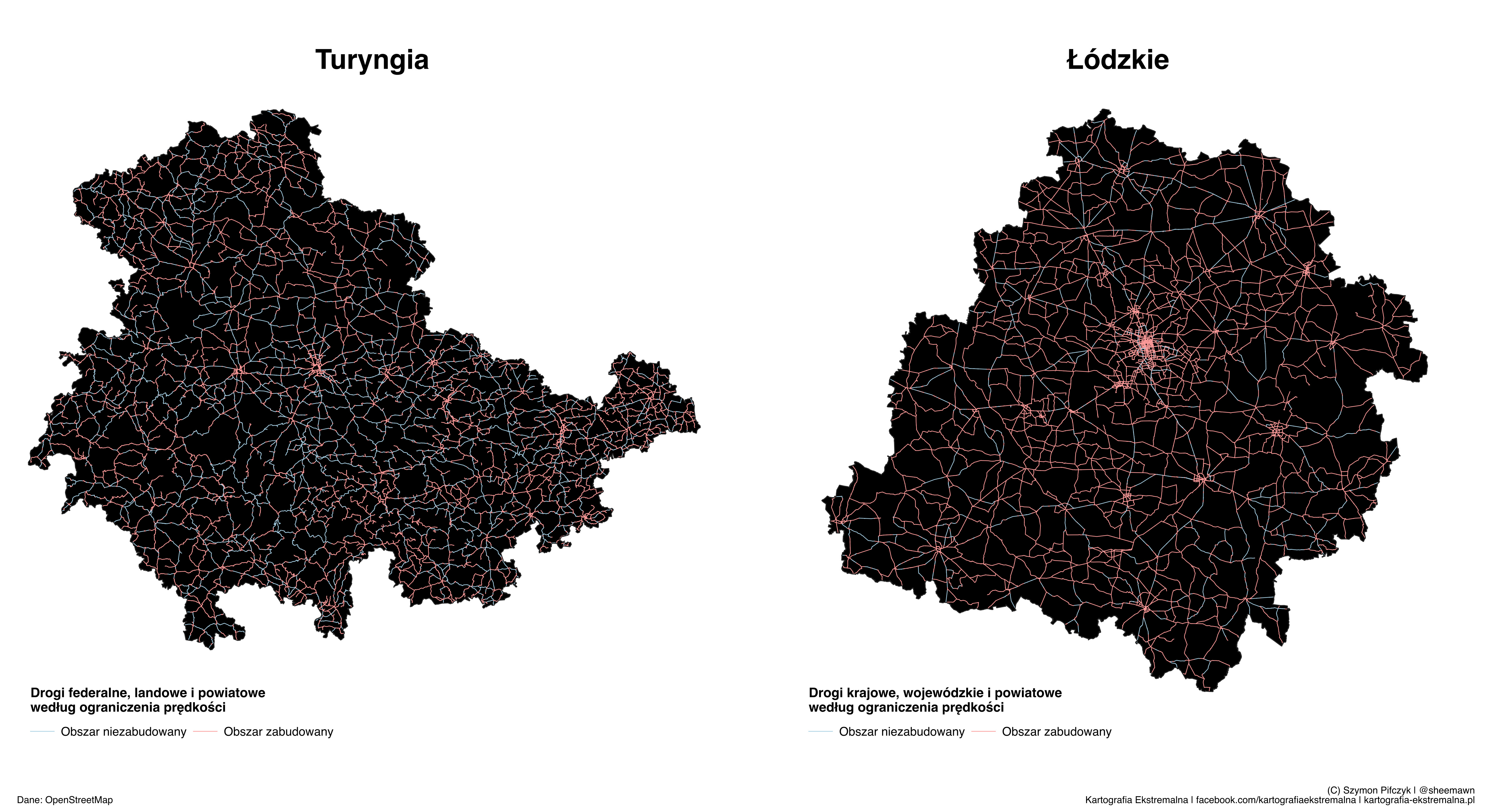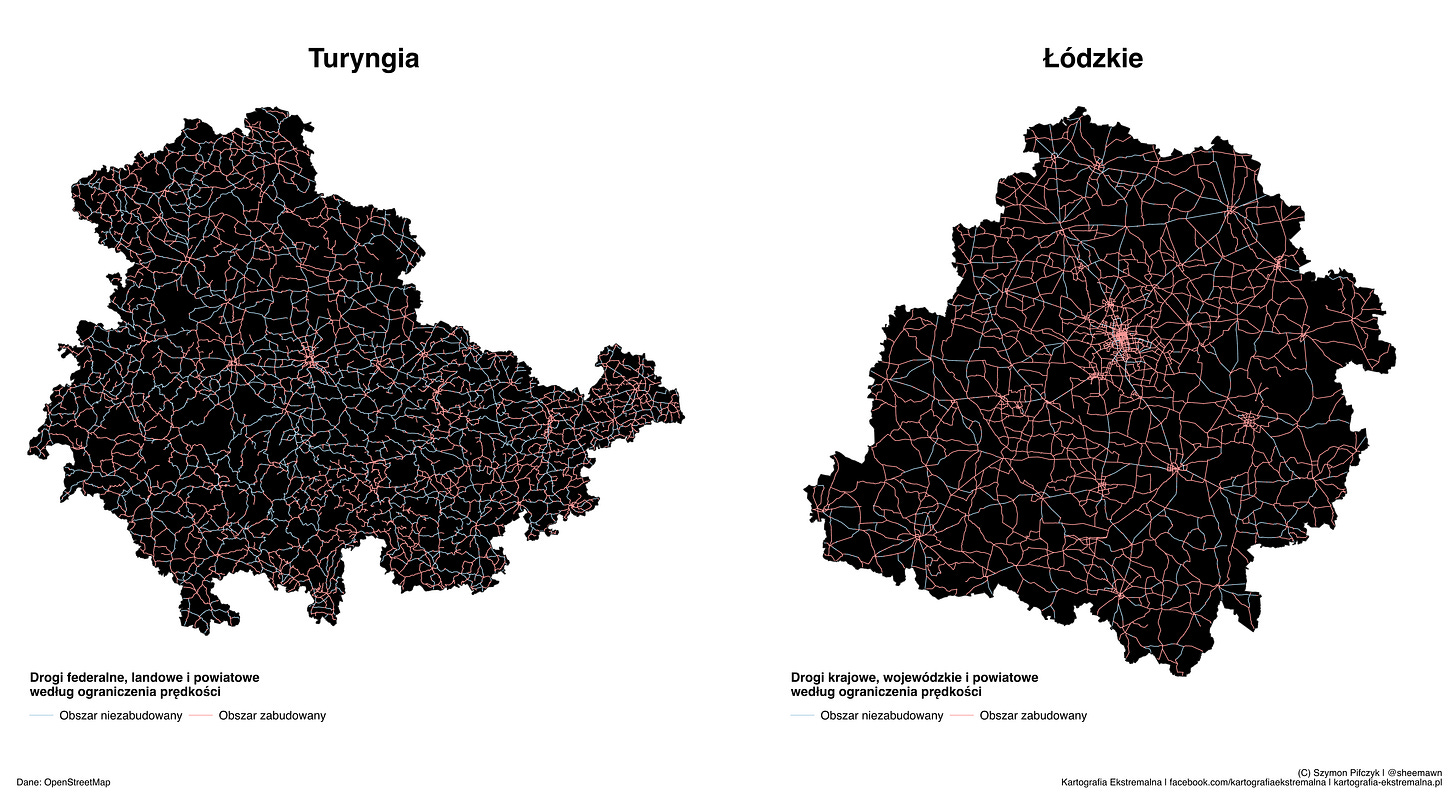 Łódzkie to — mimo stosunkowo niskiej gęstości zaludnienia, szczególnie jeśli odejmiemy samą Łódź — niekończący się obszar zabudowany. W Turyngii jadąc autem wjeżdżamy do miejscowości, po 300 metrach ją opuszczamy i potem mamy 1-2 km obszaru kompletnie niezabudowanego aż do następnej miejscowości. Widać to na kolejnej mapie — dróg krajowych, wojewódzkich i powiatowych (oraz ich niemieckich odpowiedników) pokolorowanych według ograniczenia prędkości. Polecam tę mapę przybliżyć. Zobaczymy, że w Turyngii małe miejscowości nie mają obwodnic, ale przejazd przez nie jest błyskawiczny, bo są skupione, więc ograniczenie do 50 km/h obowiązuje przez ledwie kilkaset metrów, by zaraz wrócić do 90 km/h. W łódzkim dla odmiany prawie nigdy nie wyjeżdża się z terenu zabudowanego.