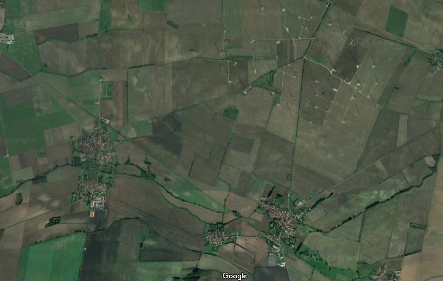 Jeśli jednak spojrzymy na teren zabudowany w obu regionach, zobaczymy znaczną różnicę w tym, jak on wygląda. W Turyngii mamy urbanistykę typową dla Niemiec, Węgier, Słowacji czy Czech: skupiska budynków (miejscowości) otoczone terenami całkowicie niezamieszkałymi (polami i lasami) aż do następnej miejscowości. Na zdjęciu satelitarnym poniżej u góry po prawej jest farma wiatraków — położona niecały kilometr od najbliższych zabudowań, bo zwyczajnie między dwoma miejscowościami były ponad dwa kilometry całkowicie niezabudowanej przestrzeni.