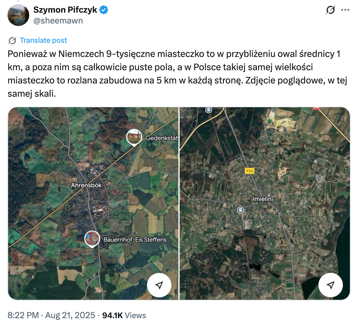 Wiele osób skonfrontowanych z tym faktem odpowiada, że chyba chciałbym, żeby wszyscy mieszkali w chowie klatkowym, a oni wolą dom z ogrodem. Ale to jest fałszywa dychotomia. Po pierwsze, w Polsce można jak najbardziej mieszkać w bloku (“chowie klatkowym”) i jednocześnie w chaotycznej, pozbawionej usług okolicy. Wybitnym przykładem jest tu koniński dom seniora. Ale nawet abstrahując od tego, to nie jest tak, że Niemcy mieszkają w klatach. Niemcy mają średnio większe mieszkania, a na tych wioskach w Turyngii przecież też nie ma bloków, tylko domy jednorodzinne. Różnica polega na tym, że Helmut ma za płotem sąsiada Ericha, zaś Janusz ma za płotem wulkanizację, a z drugiej strony centrum logistyczne.