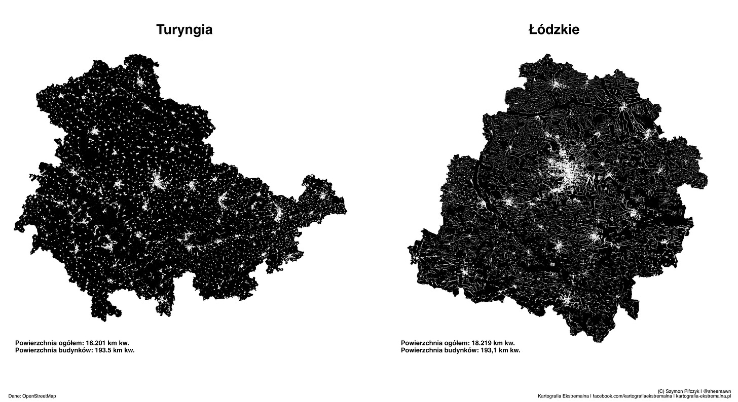 Te przykłady powyżej nie są jakoś specjalnie wyselekcjonowane. Jeśli stworzymy mapę budynków w obu regionach, zobaczymy, że taki typ zabudowy jest typowy dla całego landu czy województwa.