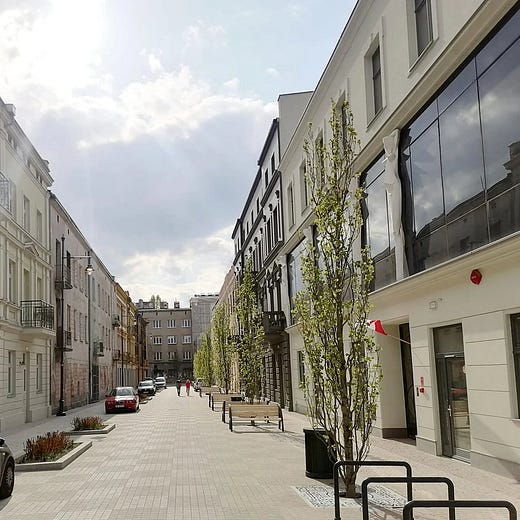 Moje subiektywne odczucia dotyczące Łodzi tylko się poprawiają. Kiedy byłem tam pierwszy raz, Michał zabrał mnie na spacer po Śródmieściu, gdzie w pewnym momencie zapytał mnie, czy chcę poznać “prawdziwe łódzkie klimaty”, na co odpowiedziałem, że chętnie. Przeszliśmy więc ulicą Włókienniczą. To boczna ulica niedaleko słynnej łódzkiej Piotrkowskiej. Wtedy (a było to ok. 5-6 lat temu), klimat tej ulicy był taki, że szło się tam naprawdę z ręką na sercu, w oczekiwaniu nie czy, ale kiedy ktoś wyjdzie z nożem z bramy kamienicy, żeby troskliwie zapytać, czy mamy jakiś problem. Na Śląsku jest wiele zaniedbanych ulic i dzielnic, ale muszę przyznać, że Włókiennicza jakoś szczególnie zapadła w moją pamięć. Jakież więc było moje zdziwienie, kiedy zobaczyłem zdjęcia Włókienniczej dzisiaj — ta ulica, jedna z wielu kompleksowo rewitalizowanych w ostatnich latach w stylu na woonerf1, w każdym górnośląskim mieście byłaby teraz salonem miasta.