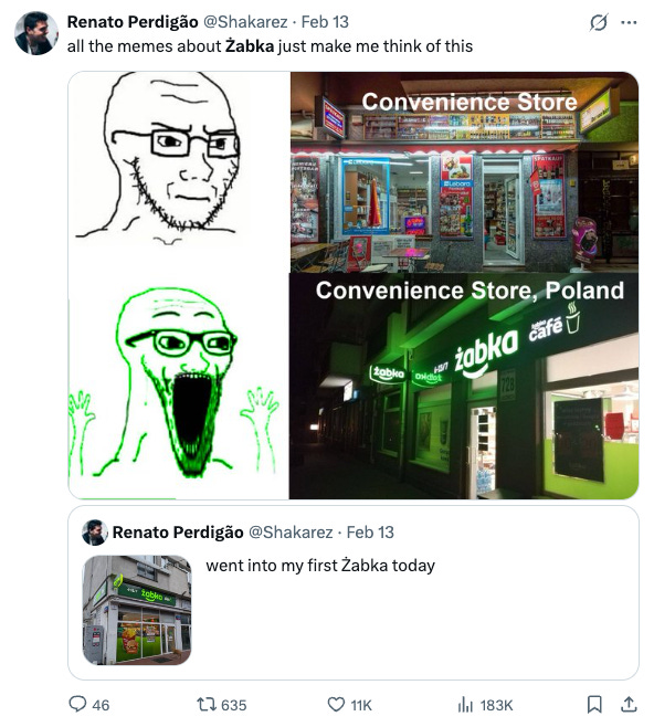 Jeśli spędzacie trochę czasu na Instagramie albo Twitterze (czy tam X-ie) to na pewno spotkaliście się z wiralowymi wpisami o Żabce. Sam się do tego też przyczyniłem wrzucając na obie te platformy wideo o sklepie Żabki otwierającym się naprzeciwko istniejącego w Katowicach (okazało się, że nie będą to sklepy konkurencyjne — po prostu ten z prawej się tam przenosi). Swoisty szał na Żabkę dotknął również obcokrajowców sprowadzających się do Polski.