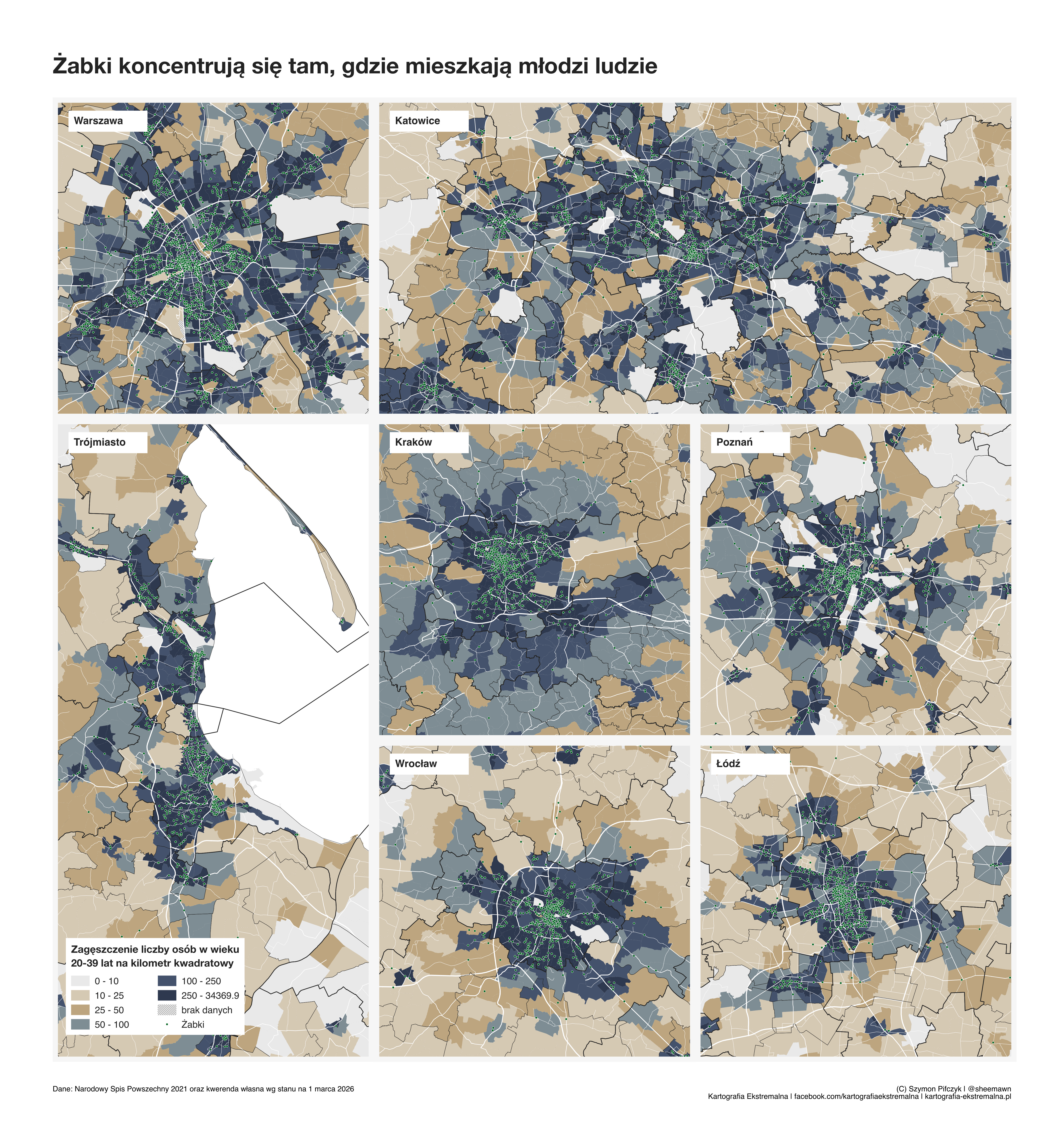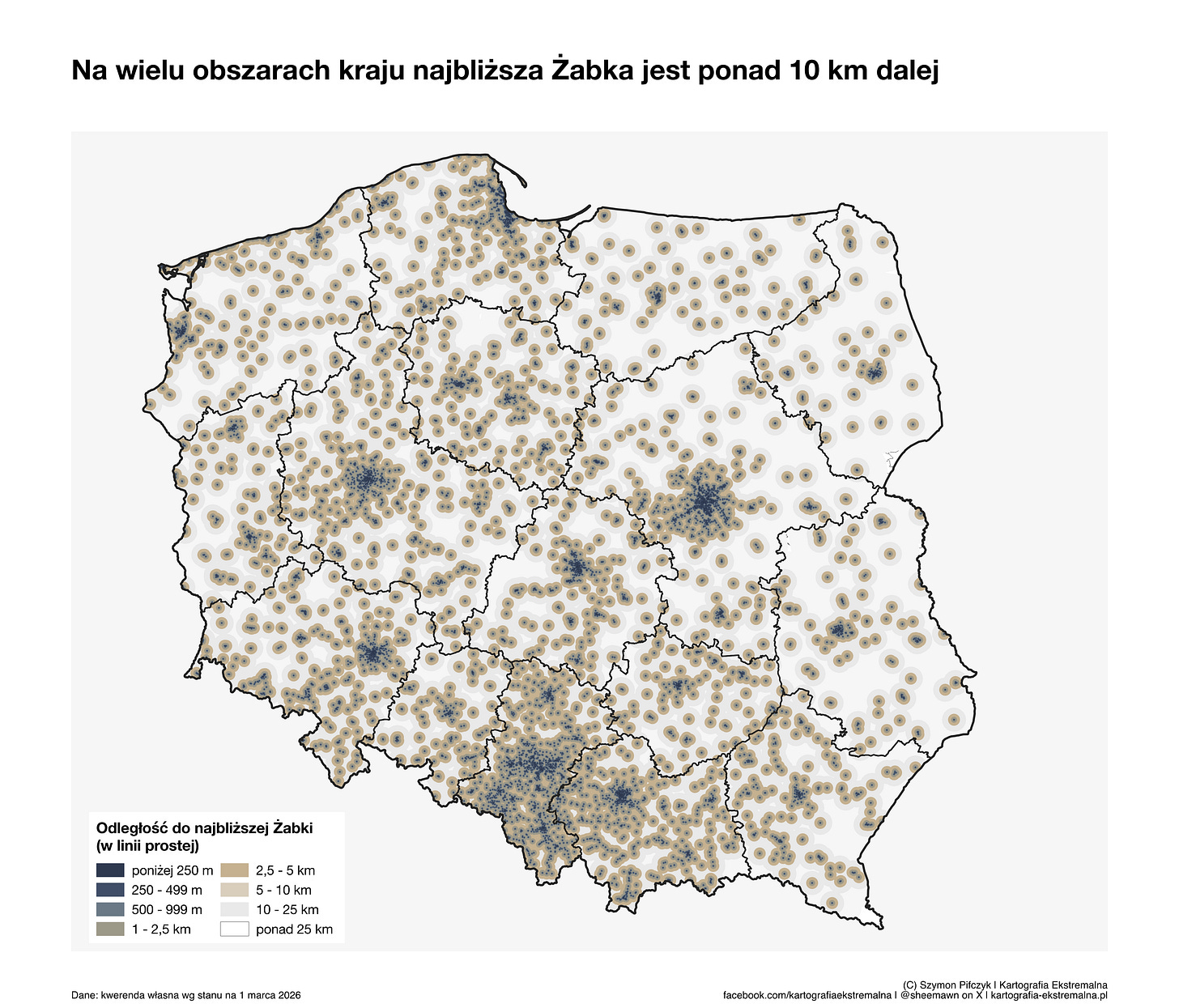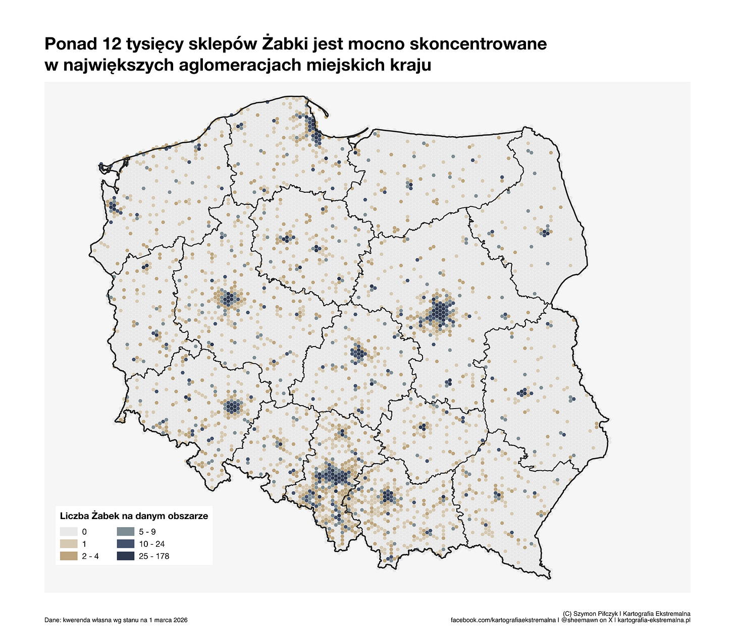 W Polsce Żabka ma, według danych na 1 marca 2026, 12577 sklepów — jeden na niecałe 3 tysiące Polaków. Przeciętny Polak ma do najbliższej Żabki nieco ponad 2,5 kilometra. Jeśli jednak spojrzymy na mapę ich rozmieszczenia, zobaczymy, że sklepy Żabki są mocno skoncentrowane w największych aglomeracjach miejskich.