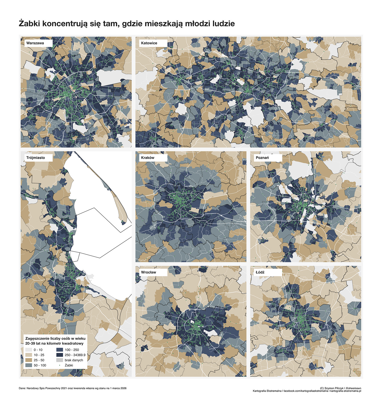 W tych aglomeracjach przeciętne odległości do Żabki są też o wiele mniejsze. Niemal dokładnie jedna czwarta Polaków — 9,4 mln osób — ma do najbliższej Żabki mniej niż 250 metrów, a kolejne 16,6% ma do niej mniej niż 500 metrów. W Warszawie mniej niż 250 metrów do Żabki ma 62% mieszkańców, we Łodzi 59%, w Krakowie i Poznaniu 58%, a we Wrocławiu 56%. Najbardziej “użabkowiony” jest jednak Chorzów, gdzie w promieniu 250 metrów od sklepu z płazem mieszka ponad 2/3 mieszkańców.